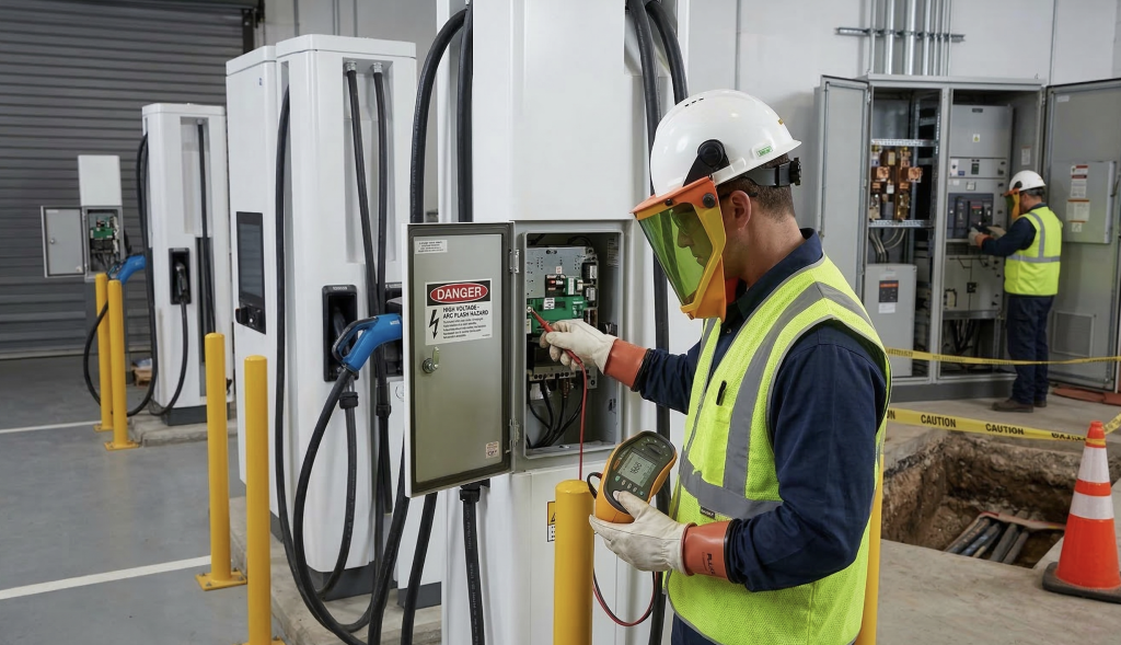 - Ark Patlaması (Arc Flash) ve Elektrik Şoku: Yüksek akımlı DC hızlı şarj (DCFC) ünitelerinin kurulumunda, yanlış izolasyon veya kısa devre durumunda ölümcül ark patlamaları meydana gelebilir.